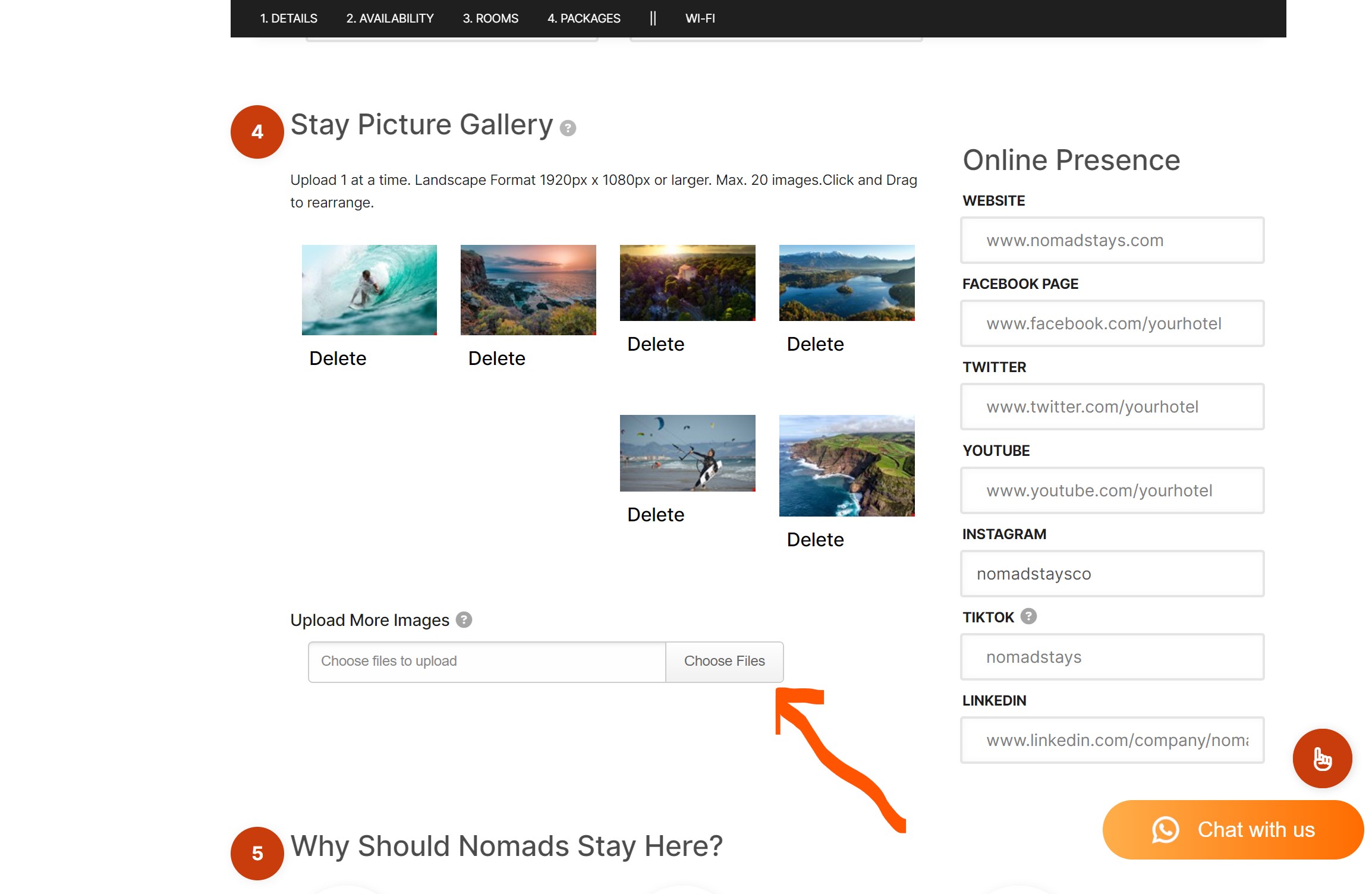 Ensure to scroll the Details page and add external and internal photos to display on your Listing, these picture will be a deciding factor for anyone wanting to book to be sure to add, location images, people enjoying facilities and other main features of your stays experience.